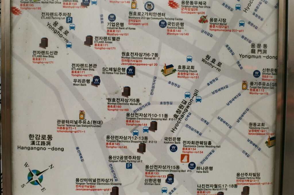 I was super happy with my new camera. Moreover I was also super excited as I knew this camera would be a great lasting memory of this trip itself! The district in Seoul where I bought my film camera is called Yongsan. I would have never remembered it. However luckily I used the first clicks films of the roll to take some pictures of the place and map. It’s amazing to see how many electronics markets located in that particular area of Seoul.