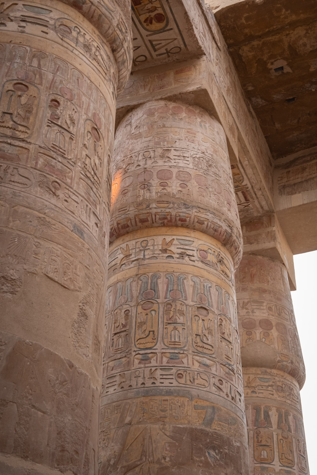 The columns are completely covered with carvings and hieroglyphs, showing pharaohs making offerings to the gods, celebrating victories and telling stories about their reign. Even today, thousands of years later, many of these carvings are still visible and incredibly detailed.
